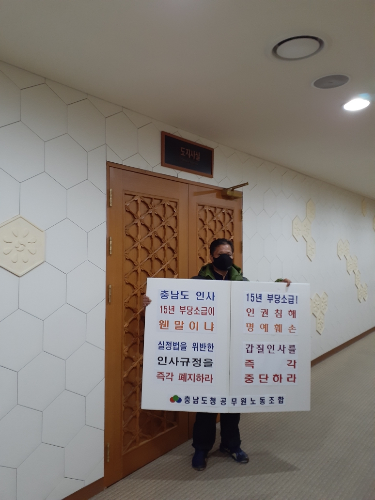 양승조 지사 인사 재량권 남용에 맞서 장외 집회 신고 마쳐 충남도청공무원노조 "양승조 지사 인사재량권 남용" 강한 비판 충남도청공무원노조 "양승조 충남지사 인사재량권 남용" 충남도청노조, 도 인사권 남용 등 장외투쟁 선포! 인사재량권을 남용한 도지사에 대한 장외투쟁 선포 (속보) 충남도청공무원노동조합, 양승조지...